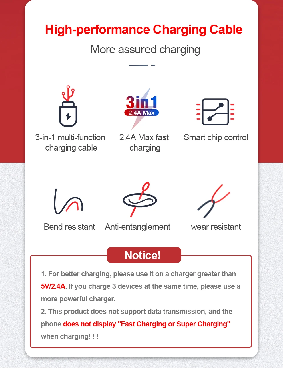 Use it every day to charge my phone and my tablet plus my grandson took my other one so i had to get this which is my second one so i definitely love ...MoreUse it every day to charge my phone and my tablet plus my grandson took my other one so i had to get this which is my second one so i definitely love it![3In1 Fast Charging Cable Cord For iPhone Xiaomi photo review]()