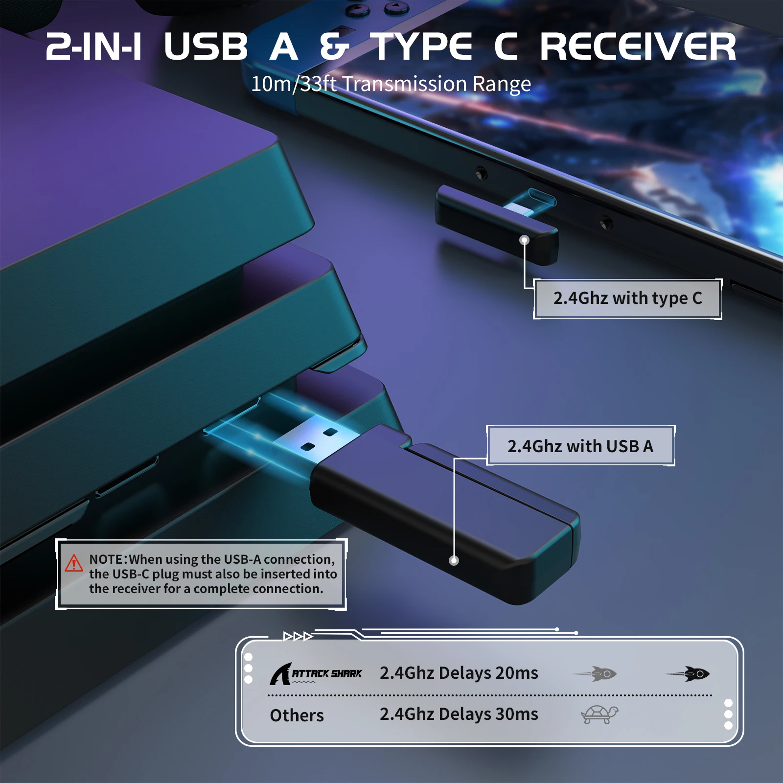 Unlike most single-mode connection headsets, our L80 headsets can meet the three connection methods of wired/Bluetooth/2.4G Wireless. Using advanced lightseed wireless transmission technology, the 2.4G dual-head receiver (regular USB head + type C head) connection delay is as low as about 20ms, high performance and low latency, providing gamers with an immersive experience and a wider range of usage scenarios.(Note:Short press twice in succession to switch Bluetooth/2.4G mode).