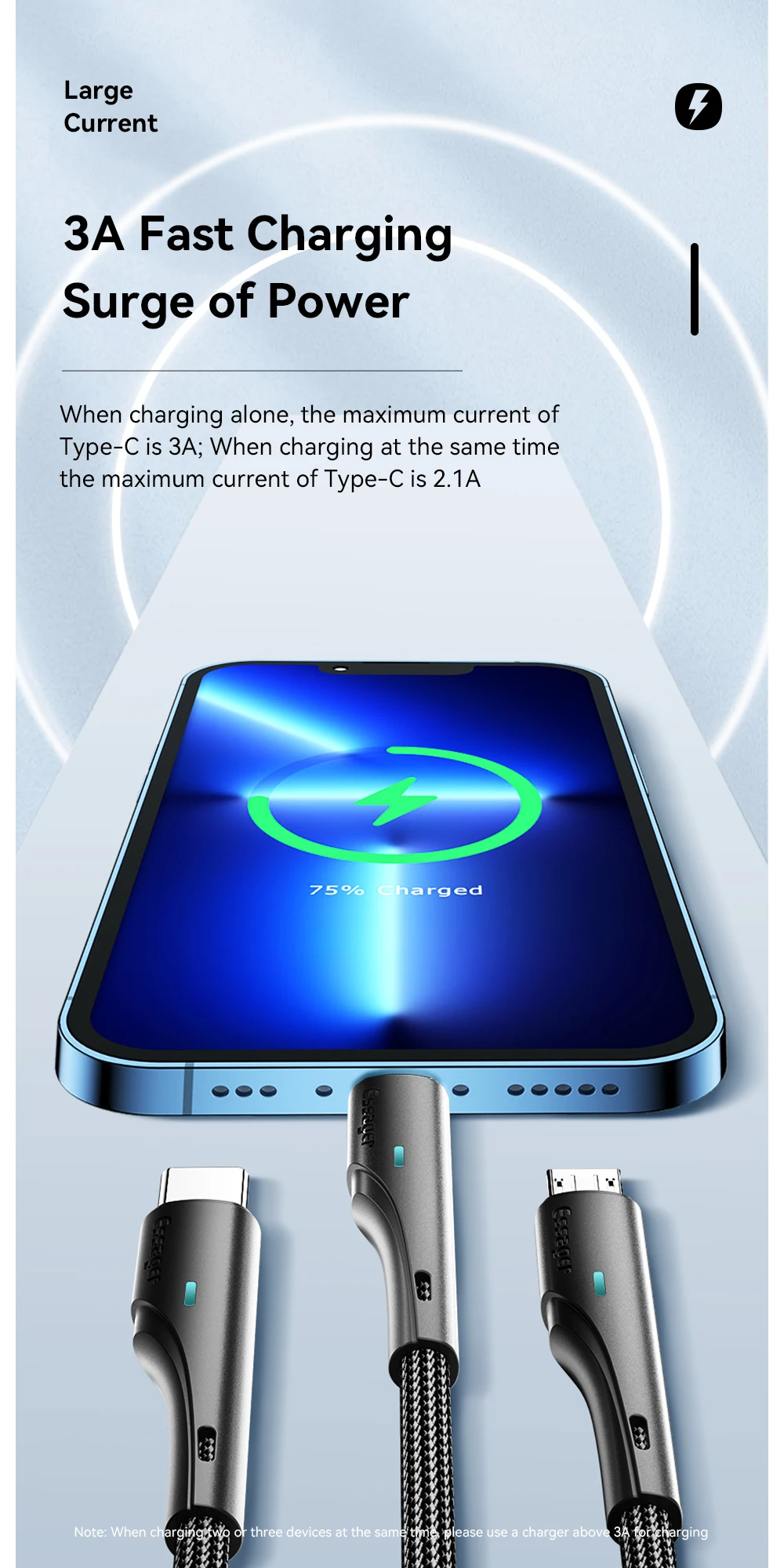 • Fast Charging :With a maximum current of 3A, this cable can charge your device quickly and efficiently.