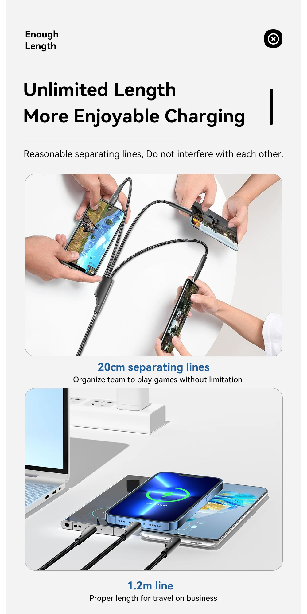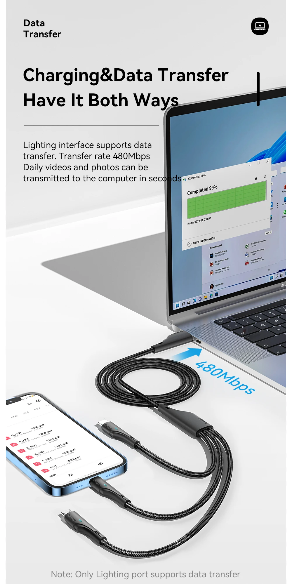 Rapid flash charging, soaring electricity When charging alone, the maximum Type-C current is 3AThree sets of equipment will be completed on the first line. First-line Lighting Type-C in place of Mcro Three fast charging lines, economical and practical at the same time also release desktop space, go out is not cumbersome3. charging transmission without delay for Apple interface supports data transmission, transmission rate 480MbpsDaily video photos can be sent to the computer in seconds.