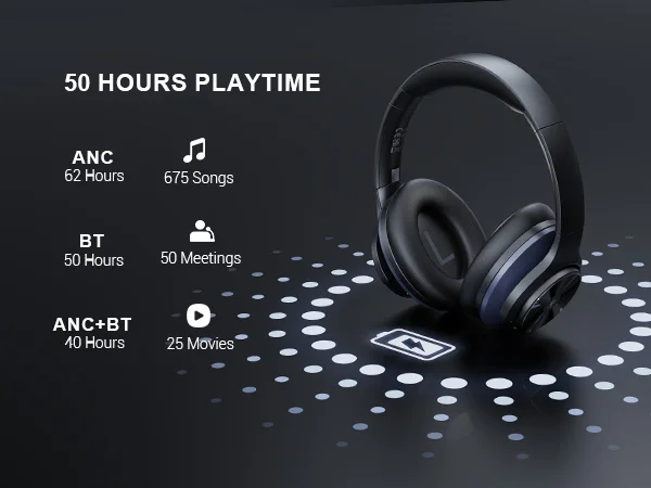 The premium Li-ion battery provides 50 hours of earphone music, movie watching, or talk time in Bluetooth mode (at 70% volume), 62 hours in active noise cancellation mode. Also you can use wired mode when the headphone is out of power. Ideal for travel and everyday use, indoors and outdoors.