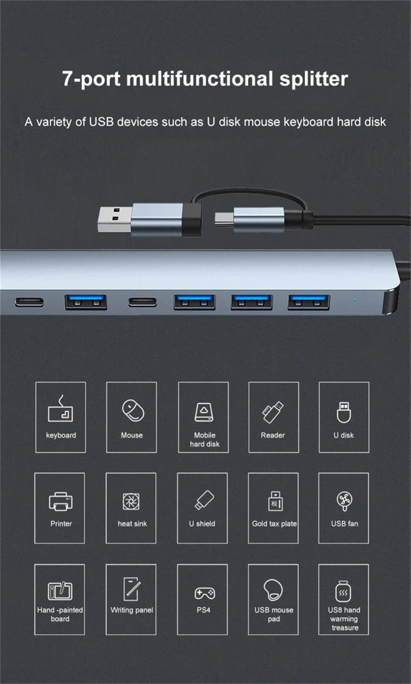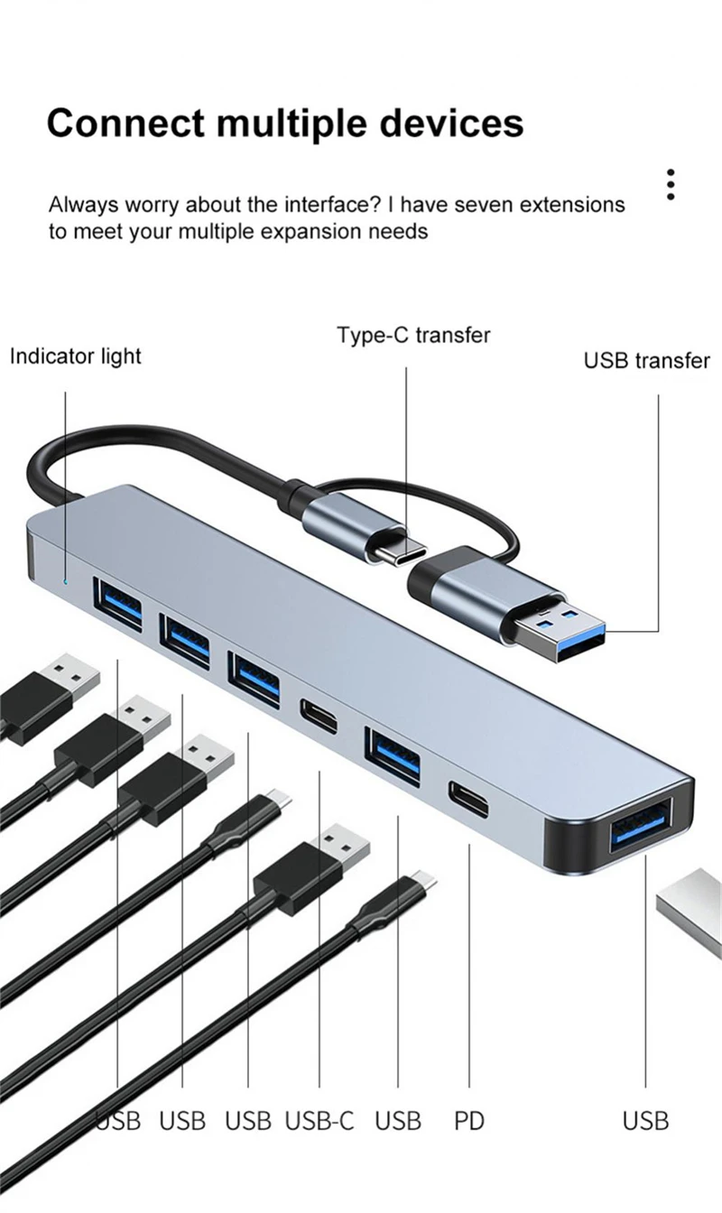 4. Fast Data Transfer: The multiport hub adapter provides USB interfaces that support high-speed data transfer. Connect external hard drives, USB flash drives, keyboards, and mice to easily transfer files and backup data quickly.